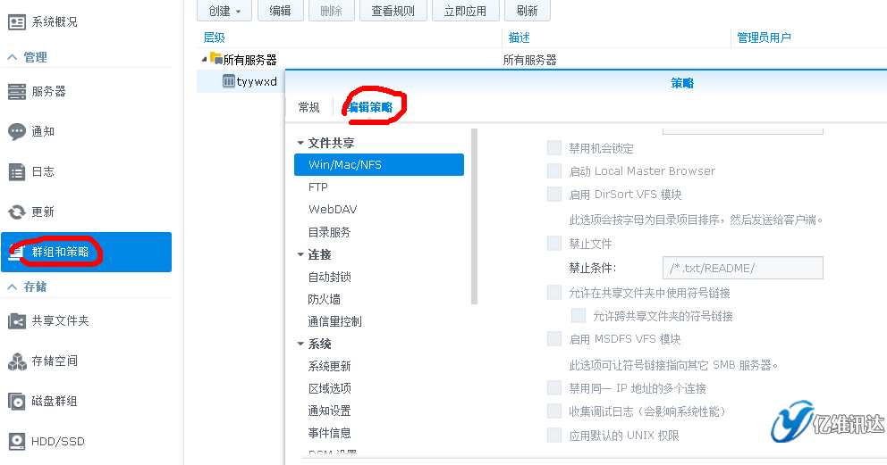 群晖Synology 山西总代:太原亿维讯达科技 策略是一系列规则,其中每个规则都是指定的设置首选项,如启用 Windows 文件服务或启用 SSH 服务。当一项策略被应用到托管服务器或服务器组后,被该策略规则定义的首选项将应用到该服务器或服务器组。这可让您将统一的设置应用多台服务器而无需分别登录每台服务器。